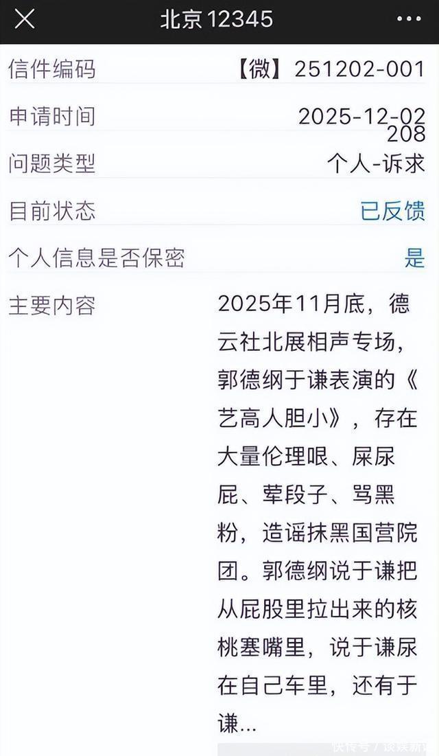演出结束后,就有网友向北京有关部门反映情况,投诉郭德纲的相声作品《艺高人胆小》里,充满大量“屎尿屁、荤段子”。 还涉嫌故意抹黑地方表演院团,把艺术处、演出处和业务处等统一称为“畜类”,把理发师小杰故意说成“小姐”等等,列举畜诸如类似多个细节。